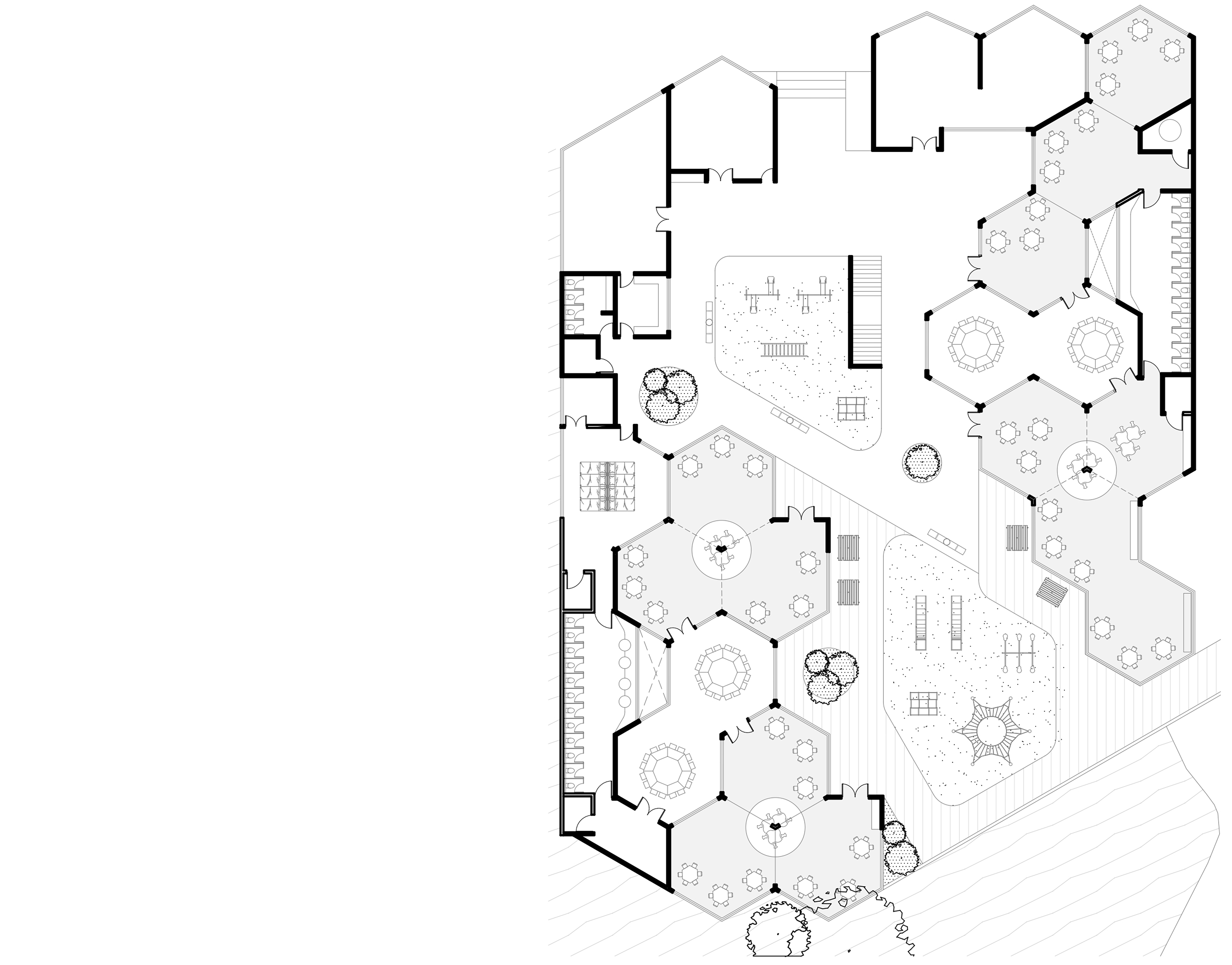 The hexagonal shape layout component naturally enhances internal circulation, allowing for better airflow and natural light distribution, which supports healthier and more comfortable spaces for children. Additionally, this layout improves supervision and safety by providing teachers with clearer sightlines across the classroom, ensuring that every child is visible and engaged. Altogether, the hexagon-shaped classrooms nurture social development, creativity, and a secure atmosphere tailored to the needs of early childhood education.