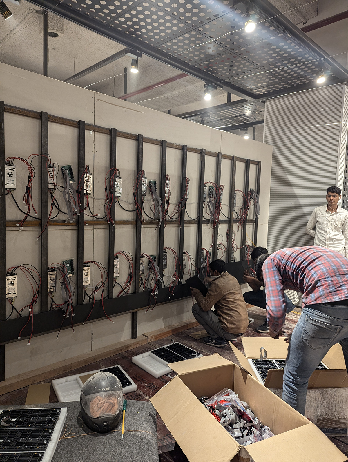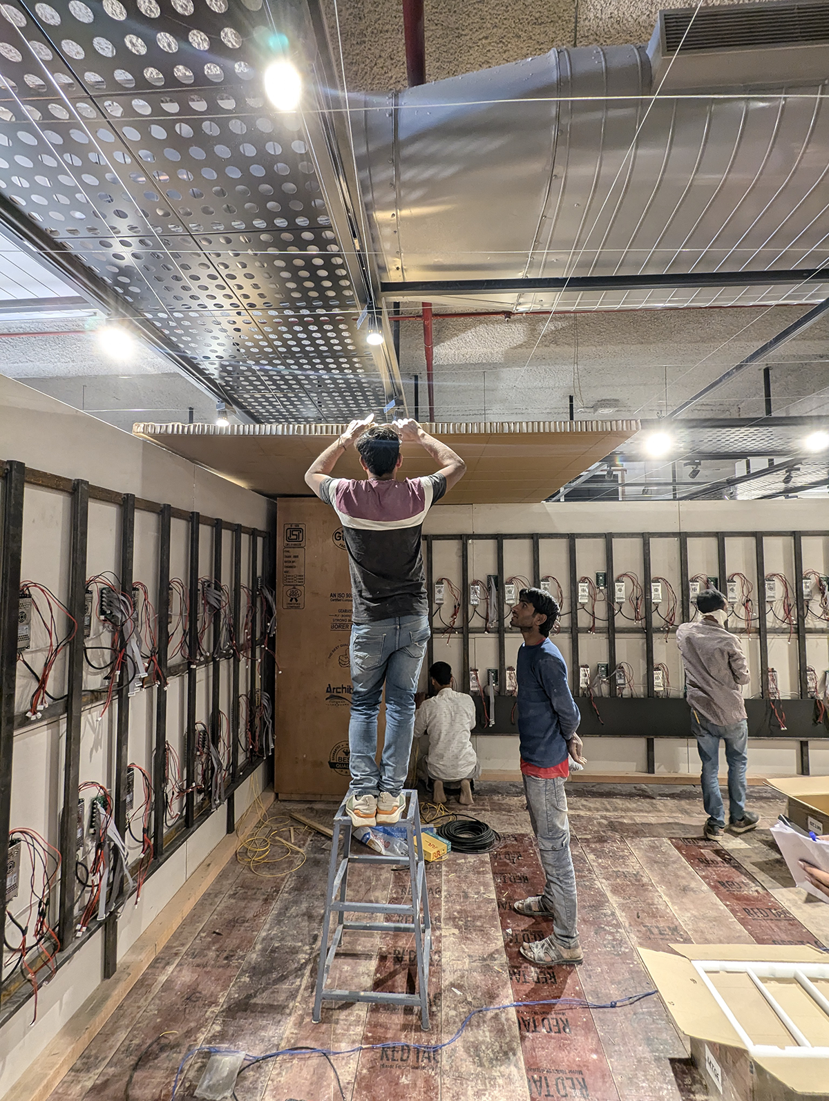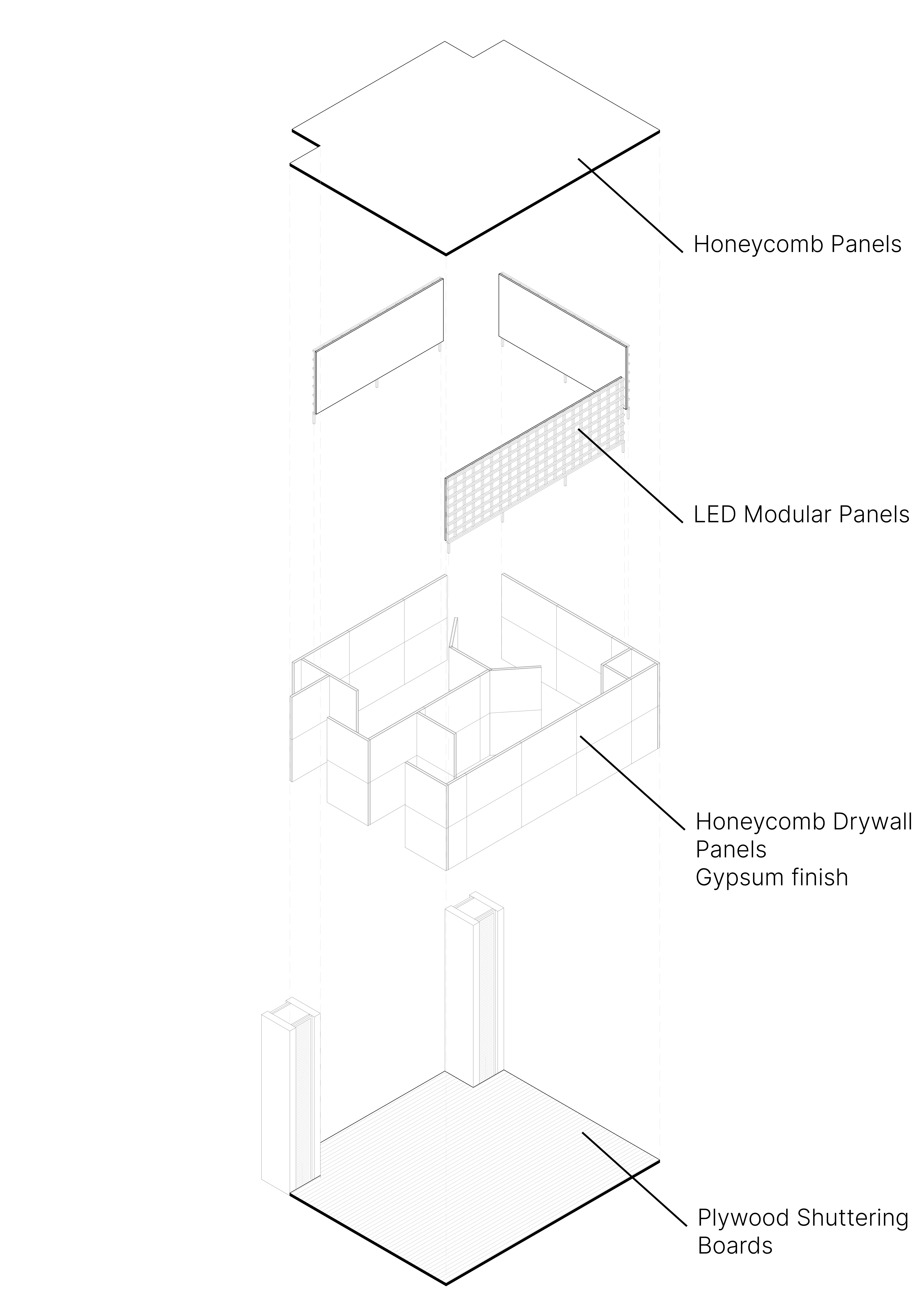 To counter this, the roof’s acoustic insulation was made from biodegradable cardboard panels, while modular drywall systems with honeycomb cardboard cores were later repurposed at our construction sites as temporary worker shelters. The LED panels were borrowed from our collaborator and reassembled using their modular system, and the flooring comprised standard shuttering plywood and boards that returned to active construction use after the exhibition. All graphic materials were printed on paper rather than plastic-based flex, ensuring that the entire installation remained environmentally responsible and circular in its material life cycle.