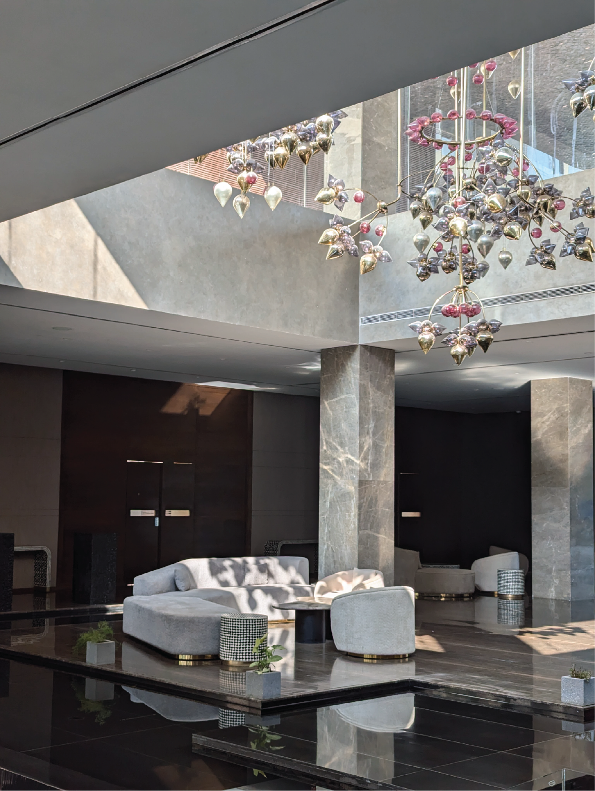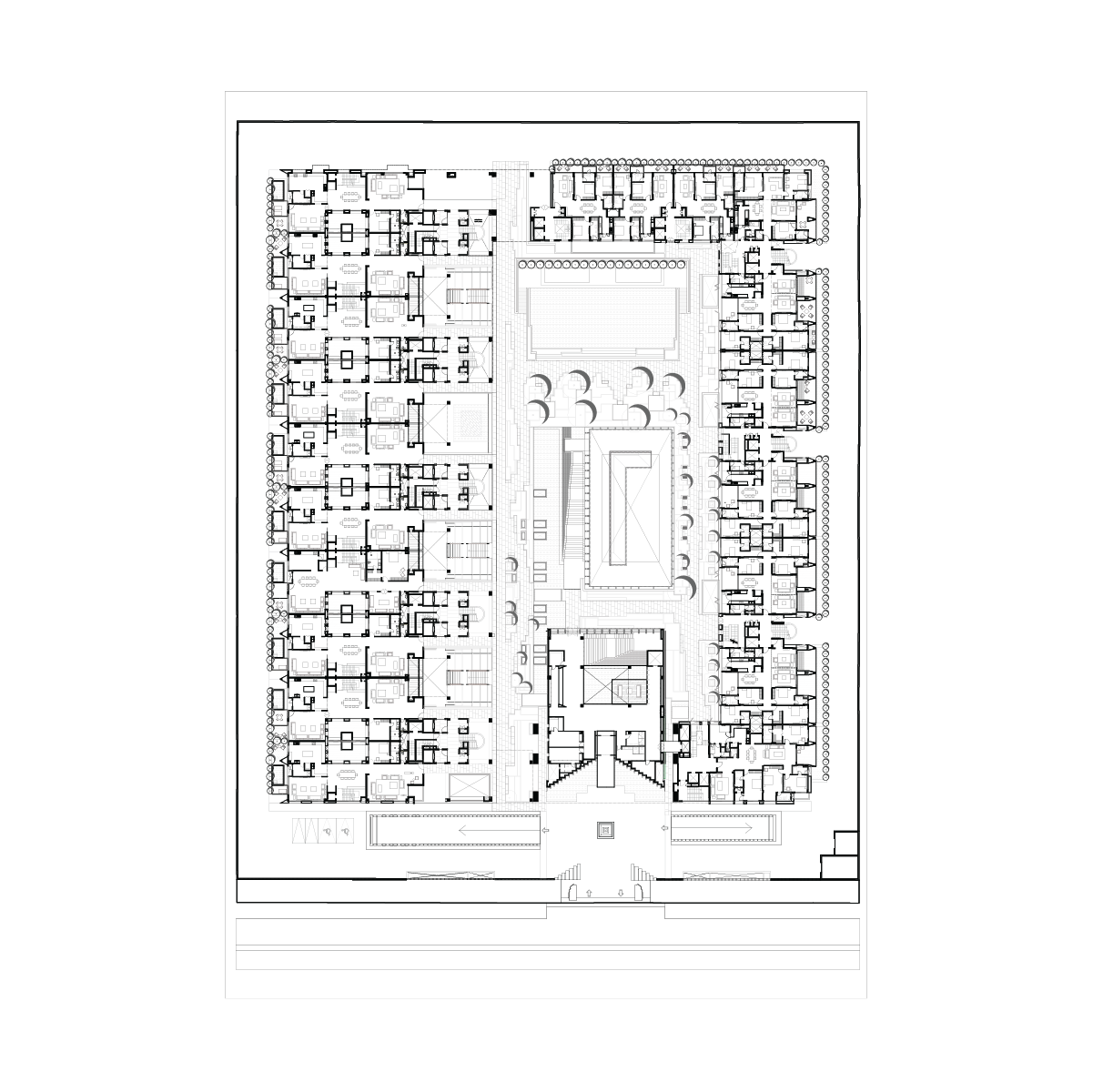 The project offers a complex configuration of single and multi-level apartments at upper floors and garden villas at the lower floor with expansive Club areas integrated into the Central Court gardens. The grand Concierge Lobby sets the tone of luxury and fine living for the development while concealing the inner court from the sight and sounds of the busy street it opens on to. The massive building bridge element above it is a tribute to the importance of the site context and lends the character to its name, evoking a sense of palatial dimensions.